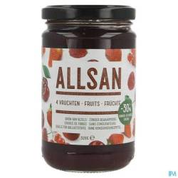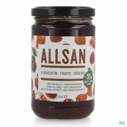 Pâte à tartiner 4 fruits Allsan, 30 % de sucre en moins, source de fibres, sans conservateur.