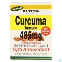 Curcuma 485 mg d'Altisa contient dans une seule capsule végétale 485 mg d'extrait concentré de curcuma en poudre (à haute teneur [95 %] en curcumine) associé à l'extrait de poivre noir BioPerine® de Sabinsa, qui améliore l'absorption et contient une forte concentration de pipérine [90 %].