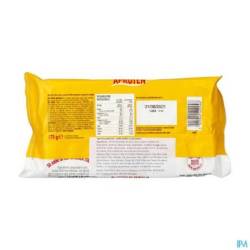 Ingrédients : fécule de pomme de terre, sucre, matière grasse végétale non hydrogénée (palme, palmiste), dextrose, farine de maïs, émulsifiant (lécithine de SOJA), poudre à lever : bicarbonate de sodium, arômes, épaississant (gomme guar).