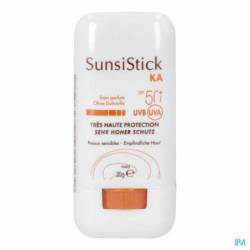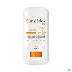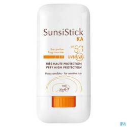 SunsiStick KA SPF 50+ s'emploie sur les zones localisées du front, du nez, des pommettes, du crâne, du dos des mains... Il offre une très haute protection solaire quotidienne aux peaux sensibles, à risque, et sujettes aux kératoses actiniques. Sa formule au fini transparent s'applique très facilement, même sur les zones les plus sensibles. Au coeur de SunsiStick KA SPF 50+, un complexe d'actifs unique, issu de la Recherche Pierre Fabre et composé : - D'un système filtrant stable et efficace dans le temps pour une très large protection UVB-UVA. - D'un duo d'antioxydants complémentaires : Thialdine pour protection cellulaire immédiate + Provitamine E (Pré-tocophéryl) pour une protection cellulaire globale contre le stress oxydatif. - De Vederine™, actif permettant d'augmenter l'expression des récepteurs de la vitamine D et de renforcer la barrière cutanée. Sa très haute tolérance cutanée a été démontrée et évaluée sous contrôle dermatologique. Rémanence longue durée*.