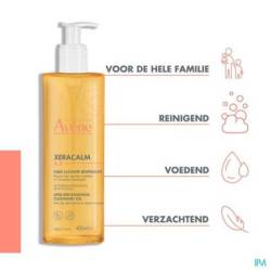 XeraCalm A.D Huile lavante relipidante nettoie en douceur et apaise les peaux très sèches sujettes à l'eczéma atopique et aux démangeaisons. Premier geste du rituel anti-démangeaisons, cette huile lavante laisse la peau douce et confortable et respecte le microbiome cutané. Sans savon et au pH physiologique, cette huile lavante relipidante peut être utilisée en phase de poussée sur le visage, le corps et le cuir chevelu. Sans parfum et élaborée en vue de minimiser les risques de réactions allergiques, XeraCalm A.D Huile lavante relipidante ne pique pas les yeux et est idéale pour la peau des nouveau-nés, des enfants et des adultes. La formule de cette huile lavante combine le 1er actif postbiotique issu de l'Eau thermale d'Avène, I-modulia®, qui diminue les démangeaisons*, stimule les défenses de la peau et lutte contre les irritations, avec des Cer-omega, lipides semblables à ceux de la peau reconnus pour nourrir et restaurer la fonction barrière cutanée et l'Eau thermale d'Avène, naturellement apaisante, anti-irritante et adoucissante.