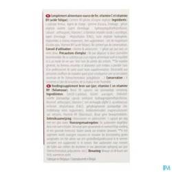 Ingrédients : Fer(II)-L-pidolate, Agent de charge : gomme d'acacia, Enrobage : capsule végétale violette (enrobage : hydroxypropylméthylcellulose, colorant : anthocyanine), Vitamine C à libération retardée (acide L-ascorbique, enrobage : éthylcellulose (E462), huile végétale hydrogénée, triglycérides à chaîne moyenne), Anti-agglomérant : sels de magnésium d'acides gras, Vitamine B9 (acide folique).