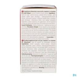Ingrédients : Agent de charge : gomme d'acacia, L-pidolate de fer(II), Enveloppe : capsule végétale violette (enveloppe : hydroxypropylméthylcellulose, colorant : anthocyane), Vitamine C à libération retardée (acide L-ascorbique, enveloppe : éthylcellulose (E462), huile végétale hydrogénée, triglycérides à chaîne moyenne), Anti-agglomérant : sels de magnésium d'acides gras, Vitamine B9 (acide folique).