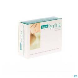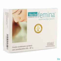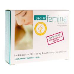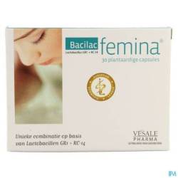 Une gélule de Bacilac Femina contient au moins 5 milliards de bactéries lyophilisées. Ingrédients : maltodextrine, agent de charge : cellulose microcristalline, Lactobacillus reuteri RC-14 (50 %), Lactobacillus rhamnosus GR-1 (50 %), anti-agglomérant : sels de magnésium d'acides gras (végétaux) Gélule végétale : hydroxypropylméthylcellulose
