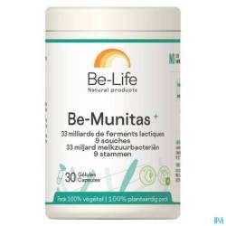 Le laboratoire Bio-Life a sélectionné des souches microbiotiques clés pour Be-Munitas+ sur la base de plusieurs critères stricts tels que l'identité des souches, leurs caractéristiques spécifiques, leur viabilité et leur stabilité dans le temps pour une flore intestinale équilibrée. Les souches en question sont résistantes à l'acide gastrique (grâce à la capsule acido-résistante), ce qui leur permet de fonctionner de manière optimale dans le système intestinal.