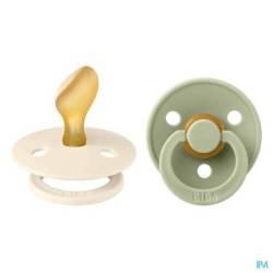 Les sucettes anatomiques Bibs ont une tétine en caoutchouc 100% naturel. Les boucliers sont en polypropylène, ce qui les rend très légers. Les sucettes avec un anneau blanc s'illuminent dans l'obscurité.