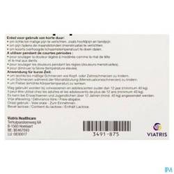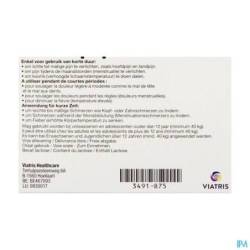 Adultes et adolescents au-dessus de 12 ans (40 kg ou plus) : Prendre un comprimé (400 mg) en dose unique, ou au maximum 3 fois par jour en respectant un intervalle de 4 à 6 heures. La prise d'une dose supérieure à 400 mg n'entraine pas un meilleur effet analgésique. Ne dépassez pas un total de 3 comprimés (1 200 mg) par 24 heures.