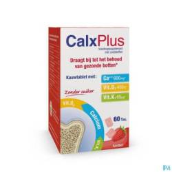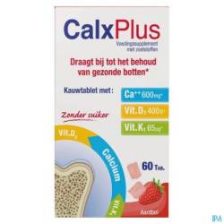 Calx Plus Sans Sucre, sous forme de comprimé à croquer, est un complément alimentaire à utiliser pour augmenter les besoins en calcium. Le calcium et la vitamine D contribuent à la santé des os et des dents et au maintien d'une fonction musculaire normale. La vitamine D favorise l'absorption normale du calcium et du phosphore, tandis que la vitamine K contribue au maintien d'une ossature normale. Les comprimés à croquer Calx Plus sans sucre ont un goût de chocolat, de vanille, d'orange ou de fraise, de sorte que vous ne sentirez pas le désagréable goût crayeux du calcium et le goût des vitamines. Calx Plus Sans Sucre contient un nombre négligeable de calories.