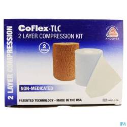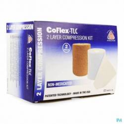 La couche 1 est un rouleau de mousse souple avec des propriétés de contrôle des odeurs et des démangeaisons et un excellent transfert d'humidité qui s'écoule pour garder la peau autour de la plaie sèche. La couche 2 est un bandage de compression sans latex, à étirement court, qui se colle à lui-même grâce à la technologie EasyTear, éliminant ainsi le besoin de ciseaux. CoFlex® TLC apporte confort et guérison en deux étapes. Il fournit une pression de 30-40 mmHg.