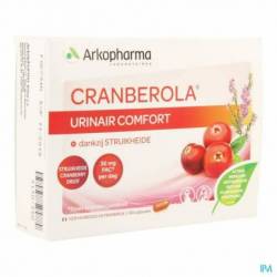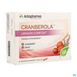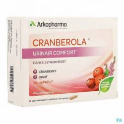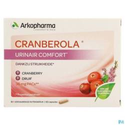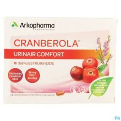 Cranberola 36 mg gélules est un complément alimentaire à base de Cranberry, d'extrait de Raisin et d'extrait de Bruyère, apportant 36 mg de proanthocyanidines totaux (PAC) par jour. La Bruyère contribue à une fonction normale d'élimination au niveau des voies urinaires.