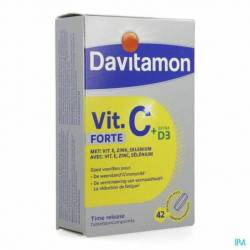 - DAVITAMON VITAMINE C FORTE contient des doses importantes de vitamines C (600 mg) et de vitamines D (400 U.I. = 10 µg), de vitamines E (12 mg), de sélénium (55 µg) et de zinc (10 mg)