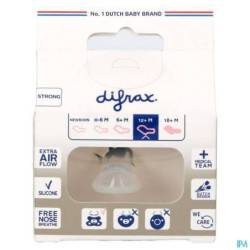 Les sucettes Difrax ont un bouclier en forme de papillon. Le nez reste ainsi libre et la tétine s'adapte parfaitement au visage du bébé. Les trous dans le bouclier fournissent un flux d'air supplémentaire, empêchant l'irritation de la peau. La taille de la protection de la tétine a été spécialement conçue pour les bébés de 12 à 20 mois environ.