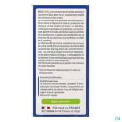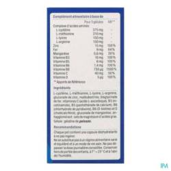 L-cystéine, L-méthionine, L-lysine, L-arginine, gluconate de zinc, maltodextrine, bisglycinate de fer, vitamine C (acide L-ascorbique), B3 (nicotinamide), B5 (pantothénate de calcium), B6 (chlorhydrate de pyridoxine), B8 (D-biotine) et D (cholécalciférol), gluconate de manganèse, anti-agglomérant : sels de magnésium d'acides gras.