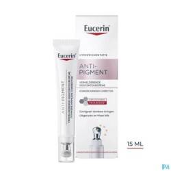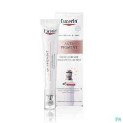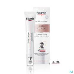 La mélanine est un pigment naturel qui détermine la couleur de la peau. L'exposition au rayonnement solaire, les influences hormonales (telles que la grossesse et la ménopause) et le vieillissement cutané peuvent entraîner une augmentation de la production de mélanine et provoquer une hyperpigmentation. L'hyperpigmentation se manifeste sous forme de cernes autour des yeux, de taches brunes et de taches de vieillesse (également appelées taches solaires) et donne à la peau un aspect irrégulier. La crème contour des yeux éclaircissante Eucerin Anti-Pigment combine de puissants ingrédients actifs qui agissent de différentes manières pour rendre votre peau plus éclatante et réduire l'hyperpigmentation à la source, tout en éclaircissant et lissant le contour de vos yeux. Sa formule fraîche à la texture légère contient du thiamidol, un ingrédient efficace et breveté qui agit à la source de l'hyperpigmentation en aidant à équilibrer la production de mélanine. Des pigments réfléchissants éclaircissent le contour des yeux pour un regard immédiatement frais et reposé. L'acide hyaluronique réduit les poches et lisse les ridules. Les oligopeptides stimulent le réseau de collagène de la peau pour une structure cutanée plus ferme. La crème s'applique facilement et précisément sur les petites zones d'hyperpigmentation à l'aide d'un applicateur métallique rafraîchissant pour une performance optimale. Les premiers résultats sont visibles dès 2 semaines, la peau paraît plus lisse et plus uniforme, et le regard frais et reposé.