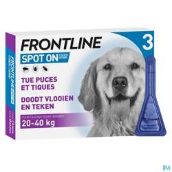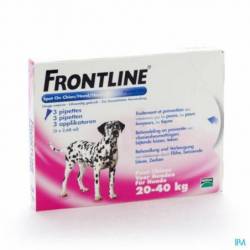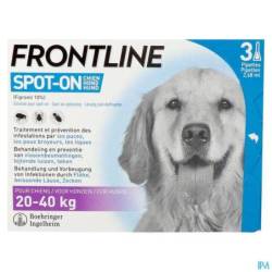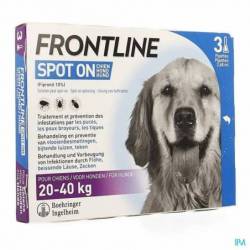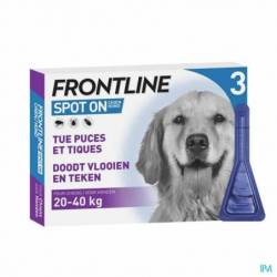 Frontline® Spot-On est un produit facile à appliquer qui procure à votre chien une bonne protection contre les puces et les tiques. Frontline® Spot-On tue les puces en 24h et les tiques en 48h. Frontline® Spot-On protège votre chien pendant 4 semaines contre les puces et 4 semaines contre les tiques. Pour les chiens de 20kg à 40kg.