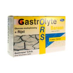 Gastrolyte O.R.S. Banana + rice est une préparation instanée avec un goût de banane agréable, possédant les propriétés de l'eau de riz. C'est un O.R.S. (= Oral Rehydration Salts), afin de soutenir un bon équilibre des fluides.