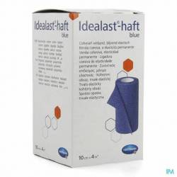 Bandage élastique de couleur bleue.Idealast®-haft est un bandage cohésif durablement élastique, à allongementcourt, d'une extensibilité de 90 % environ, l'effet cohésif des deux faces assure l'ajustement parfait du bandage, une bonne pression de travail et une faible pression au repos ; le bandage blanc radiotransparent est perméable l'air et stérilisable (vapeur à 134°C).