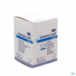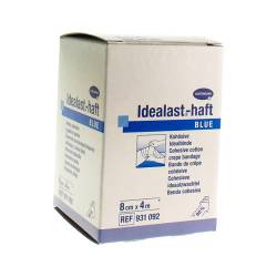 Bandage élastique de couleur bleue.Idealast®-haft est un bandage cohésif durablement élastique, à allongementcourt, d'une extensibilité de 90 % environ, l'effet cohésif des deux faces assure l'ajustement parfait du bandage, une bonne pression de travail et une faible pression au repos ; le bandage blanc radiotransparent est perméable l'air et stérilisable (vapeur à 134°C).