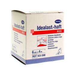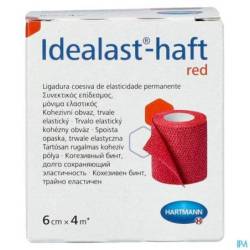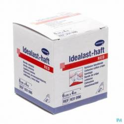 Bandage élastique de couleur rouge.Idealast®-haft est un bandage cohésif durablement élastique, à allongementcourt, d'une extensibilité de 90 % environ, l'effet cohésif des deux faces assure l'ajustement parfait du bandage, une bonne pression de travail et une faible pression au repos ; le bandage blanc radiotransparent est perméable l'air et stérilisable (vapeur à 134°C).