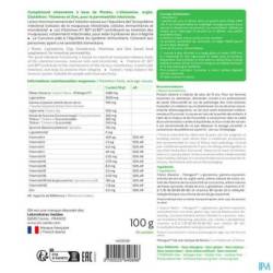Ingrédients: Fibres d'acacia - Fibregum™, L-glutamine, extraits de gamma-oryzanols de son de riz, argile verte, arôme naturel de cassis, extrait de rhizome de curcuma titré en curcumine, arôme naturel de fraise, spiruline, citrate de zinc, L-Glutathion, vitamines ADEC -B1-B2-B3-B5-B6-B12 et vitamine B9 (acide 6S-5-méthyltétrahydrofolique sous forme de sel de glucosamine).