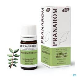 Cet arbrisseau toujours vert des rivages méditerranéens porte des grappes de fleurs vert pâle qui donneront par la suite des fruits rouges-noirs. Son écorce est incisée pour sa résine appelée mastic et que l'on mâche pour rafraîchir l'haleine. Lors des chaudes journées du mois d'août, il embaume littéralement l'atmosphère de son parfum caractéristique.