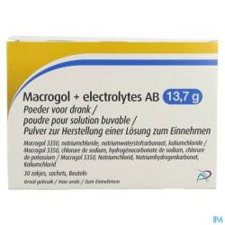Le nom de ce médicament est Macrogol + electrolytes AB 13,7 g poudre pour solution buvable, sachet. C'est un laxatif destiné au traitement de la constipation chez les adultes, les adolescents et les personnes âgées. L'utilisation chez les enfants de moins de 12 ans est déconseillée.