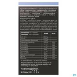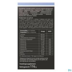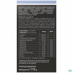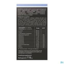 Composition pour 4 comprimés : 800 mg de l-tyrosine, 600 mg de taurine, 200 mg de l-phénylalanine, 300 mg de magnésium (80% A.R.), 1,1 mg de vitamine B1 (100% A.R.), 1,4 mg de vitamine B2 (100% A.R.), 16 mg de vitamine B3 (100% A.R.), 6 mg de vitamine B5 (100% A.R.), 1,4 mg de vitamine B6 (100% A.R.), 2,5 µg de vitamine B12 (100% A.R.), 200 µg d'acide folique (100% A.R.), 50 µg de biotine (100% A.R.), 9 mg de zinc (90% A.R.)