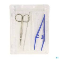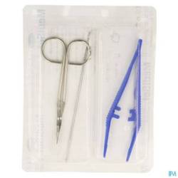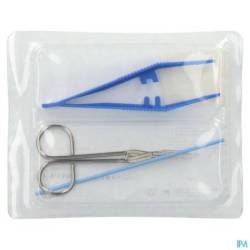 Sets de pansement dans un blister rigide 2 alvéoles :- peut servir de plateau Contenu: 1 Pince anatomique en polypropylène 12,5 cm bleu 1 Ciseaux pointus protégé 11,6 cm 1 Stylet 14 cm - métal