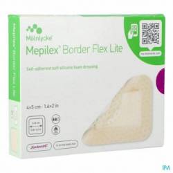 Ce modèle amélioré est doté de la technologie Flex® qui rend le pansement flexible à 360°. Ainsi, Mepilex® Border Flex Lite est quatre fois plus confortable pour les patients que son prédécesseur (Mepilex® Border Lite). La technologie Flex® permet également au bandage de mieux rester en place, ce qui réduit la nécessité de changer les pansements. Mepilex® Border Flex Lite, comme Mepilex® Border Lite, possède une couche de contact avec la plaie en silicone Safetac® qui n'adhère pas à la plaie, mais qui adhère à la peau sèche. Cette couche Safetac® en contact avec la plaie réduit le traumatisme et la douleur des tissus lors du retrait et empêche la macération de la peau environnante.