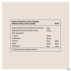 extrait de bambou : bambusa bambos, extrait de feuilles d'olivier : Olea europaea, L-cystine, L-méthionine, bisglycinate de zinc, D-biotine, chlorure d'hydrogène de pyridoxine, gélule végétale : hydroxypropylméthylcellulose, agent de charge: carbonate de calcium, anti-agglomérants : dioxyde de silicium, stéarate de magnésium.