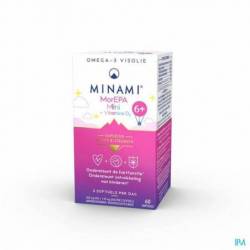 MorEPA Mini est un supplément nutritionnel avec une haute concentration (85%) d'oméga-3 (250 mg EPA + 55 mg DHA + 3,75 mcg vitamine D3) au goût de fraise pour enfants à partir de 6 ans.