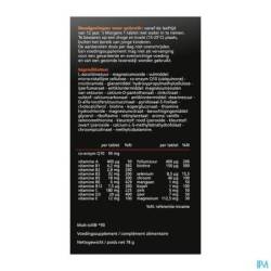 Ingrédients: Acide L-ascorbique - oxyde de magnésium - agent de charge: cellulose microcristalline - coenzyme Q10 (ubiquinone) - nicotinamide - agent d'enrobage: hydroxypropylméthylcellulose - fumarate de fer - agent anti-agglomérant: sels de magnésium d'acides gras - D-pantothénate de calcium - citrate de zinc - agent de charge: carbonate de calcium - agent anti-agglomérant: acide stéarique - succinate d'acide D-alpha-tocophérolique - pyridoxal-5-phosphate - cholécalciférol - biotine - gluconate de cuivre - chlorhydrate de thiamine - citrate de magnésium - humectant: glycérol - riboflavine - acétate de rétinyle - arôme: vanille - sélénométhionine - colorant: oxyde de fer rouge - colorant: oxyde de fer noir - calcium L-5-méthyltétrahydrofolate - picolinate de chrome - méthylcobalamine