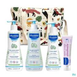 Coffret composé d'un gel lavant, d'une eau nettoyante (sans rinçage), d'un lait corporel et d'une crème pour le change.