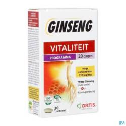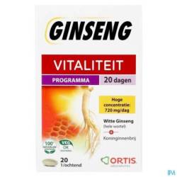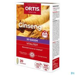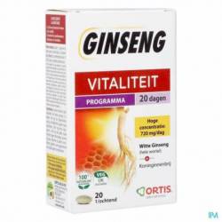 Racines complètes (dont racines capillaires) de Panax ginseng C.A. Meyer* (40 mg de ginsénosides/comprimé), gelée royale lyophilisée* (168 mg/comprimé équivalent à 500 mg de gelée royale fraîche) ; agent d'enrobage : gomme d'acacia* ; stéarine de palme* ; émulsifiant : glycérine ; anti-agglomérant : talc ; épaississant : carraghénane.