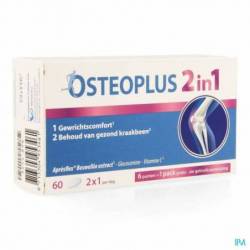 Osteoplus est conçu pour les personnes souhaitant continuer à bouger en toute liberté. À partir de 45 ans, de nombreuses personnes constatent que leurs mouvements deviennent parfois moins fluides. Pour rester souple dans ses mouvements, il est important de maintenir les articulations et le cartilage en bonne santé. Osteoplus offre une gamme de produits qui aident à maintenir les articulations en bonne condition. Osteoplus 2in1, une combinaison unique d'AprésFlex® Extrait Boswellia, de glucosamine & de vitamine C, est la cure de départ idéale. Grâce à sa double action, il offre:1. Un confort articulaire et une mobilité en 7 jours grâce à AprèsFlex® Extrait Boswellia et 2. Le maintien de cartilage sain grâce à la vitamine C*. AprèsFlex® Extrait Boswellia est un extrait breveté contenant une quantité concentrée de l'acide boswellique AKBA. Grâce à sa composition unique, il garantit une meilleure biodisponibilité, ce qui permet l'absorption d'une plus grande quantité par votre corps. De plus, son efficacité est prouvée scientifiquement**. Disponible en pack de 1 mois. Découvrez le nouveau programma de fidélité sur la notice. * La vitamine C contribue à la formation normale de collagène pour assurer la fonction normale des cartilages. ** Étude clinique en double aveugle, randomisé et contrôlé par placebo. Sengupta et al., 2010.
