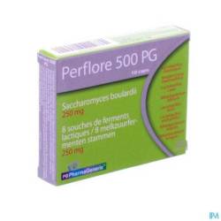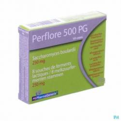 Grâce à sa forte concentration (13 milliards par gélule), Perflore 500 PG contribue au renforcement et à l'augmentation de la flore intestinale. Une gélule contient 6,5 milliards* de Saccharomyces boulardii et 6,5 milliards* d'une composition de 8 souches bactériennes déjà présentes dans notre organisme. Son utilisation est particulièrement recommandée en cas de selles molles.