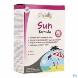 Physalis Sun formula est un complexe avec NutroxSun™, un mix de pamplemousse et de romarin cliniquement testé, qui améliore l'élasticité de la peau et réduit de manière significative les rougeurs après l'exposition au rayonnement UV. Ce complexe contient en outre de la SOD bioactive, extraite d'une espèce très spécifique de melon français (SOD B Primo-Antioxidant®, 140 IU). Contient également du β-carotène, du lycopène, de la lutéine et de l'astaxanthine (AstaPure®). De même, *le zinc, la biotine, la vitamine A, les vitamine B2 et B3 contribuent au maintien d'une peau en bonne santé. **Le sélénium et la vitamine E contribuent à la protection des cellules contre les radicaux libres. ***Le cuivre contribue au maintien d'une pigmentation cutanée normale. Avec de la L-tyrosine, le précurseur de la mélanine, un pigment naturel.