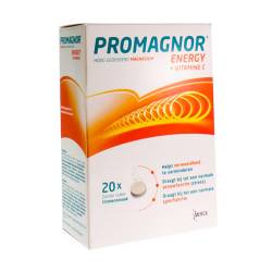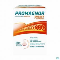 Promagnor® Energy est un supplément contenant du magnésium (400mg) et de la vitamine C (180mg). Le magnésium et la vitamine C contribuent au maintien d'un bon métabolisme énergétique et vous aident à réduire la fatigue. Promagnor est disponible en 5 formes : capsules, sachets, instant, comprimés à croquer & comprimés effervescents.