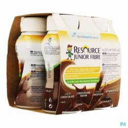 Resource® Junior Fibre goût chocolat : Eau, maltodextrine, huiles végétales (tournesol, colza), saccharose, protéines du lait, cacao maigre en poudre (1,4 %), fibres (fructo-oligosaccharides, inuline), sels minéraux (citrate de sodium, citrate de calcium, chlorure de potassium, citrate de potassium, citrate de magnésium, phosphate de sodium, oxyde de magnésium, sulfate de fer, sulfate de zinc, sulfate de manganèse, sulfate de cuivre, fluorure de sodium, iodure de potassium, sélénate de sodium, chlorure de chrome, molybdate de sodium), amidon, émulsifiant (E471), vitamines (C, E, niacine, acide pantothénique, thiamine, B6, A, riboflavine, D, K, acide folique, B12, biotine), épaississant (E407), acidifiant (E330). Sans gluten.