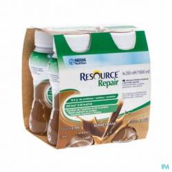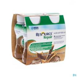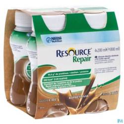 Resource® Repair Café : eau, protéines de lait, sirop de glucose, saccharose, huile de colza, acides aminés (L-proline, L-arginine), amidon, minéraux (citrate de potassium, chlorure de potassium, hydrogénophosphate de sodium, oxyde de magnésium, sulfate de zinc, pyrophosphate de fer, sulfate de manganèse, sulfate de cuivre, fluorure de sodium, chlorure de chrome, sélénate de sodium, molybdate de sodium, iodure de potassium), vitamines (C, E, niacine, acide pantothénique, bêta-carotène, B6, thiamine, A, riboflavine, D, K, acide folique, B12, biotine), émulsifiant (E471), colorant (E150d), épaississants (E418, E407), arôme. Sans gluten.