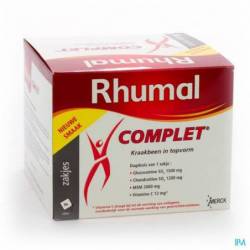 • Rhumal COMPLET est un complément alimentaire de haute qualité qui contient 1500 mg de sulfate deglucosamine pure sous forme cristalline, 1200 mg du sulfate de chondroïtine, 2000 mg de MSM et 12 mg de vitamine C (15% AJR*) par sachet. * AJR = Apport Journalier Recommandé. • Ingrédients : Sulfate de glucosamine 2KCl sous forme cristalline; Méthylsulfonylméthane; Sulfate de chondroïtine; Aromatisant: Acide citrique, Arôme d'orange; Fructose ; Agents de charge : Carbonate de calcium, Amidon de maïs; Stabilisant : Bicarbonate de sodium ; Colorant : Bétacarotène ; Acide ascorbique; Edulcorant: Sucralose. Contient des édulcorants, du sucre et des produits dérivés de carapaces de crabe. Ne pas administrer à des personnes présentant une hypersensibilité connue. • Glucosamine et chondroïtine : Il s'agit de substances entièrement naturelles, que notre organisme est capable de fabriquer lui-même. La glucosamine est le composant de base du cartilage. • MSM : abréviation de MéthylSulfonylMéthane, est une source de soufre naturellement présente dans l'organisme humain. Largement sous-estimé, notamment dans l'alimentation, le soufre est pourtant un minéral important pour notre organisme. Il y occupe la troisième place (en termes de quantité) juste derrière le calcium et le potassium. Et chacune de nos cellules en contient. • Propriétés de la vitamine C : la vitamine C contribue à la formation de collagène, pour le maintien du bon fonctionnement du cartilage articulaire. Tous les produits de la gamme Rhumal sont élaborés à partir de matières premières NATURELLES, purifiées et de haute qualité. Ils vous assurent par conséquent une grande sécurité, une excellente tolérance, sans effet gastrique.