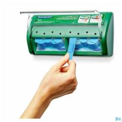 Le distributeur de pansements Salvequick Bleus détectables est spécialement conçu pour une utilisation dans l'industrie alimentaire. Le pansement Salvequick Bleu détectable est repérable et peut être détecté par la plupart des détecteurs de métaux. Grâce à sa couleur bleue, il est facile à voir. Lorsque l'on tire un pansement du distributeur, l'une des surfaces adhésives se libère, et il peut être appliqué d'une seule main. Une clé spéciale permet de recharger rapidement le distributeur. Un couvercle transparent protège contre la poussière. Nettoyer la plaie et veiller à ce qu'elle ne soit pas infectée. Changer le pansement tous les jours.
