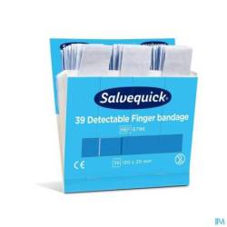 Les pansements bleus détectables Salvequick pour les doigts sont des pansements bleus extra longs qui peuvent être facilement enroulés autour du doigt. Souples et flexibles, ils sont détectables par la plupart des détecteurs de métaux utilisés dans l'industrie alimentaire. Nettoyez la plaie, assurez-vous qu'elle n'est pas infectée et changez le plâtre tous les jours.