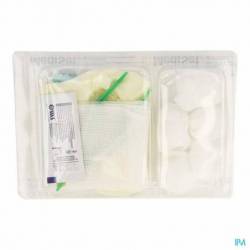 Set de sondage dans un blister rigide 2 alvéoles:- le blister rigide peut servir de plateau - petite alvéole pour contenir des liquides Contenu: 2 Gants d'examen vinyle non poudrés Peha-soft Syntex (aspect latex) - M 1 Champ imperméable 60 x 60 cm 5 Tampons de gaze Pagasling, T3 prune 1 Pince anatomique 12,5 cm - vert 1 Compresse de gaze 7,5 x 7,5 cm - 8 plis 1 Gel lubrifiant 2,7 g