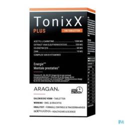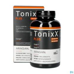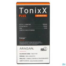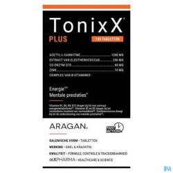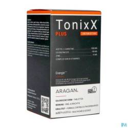 2 comprimés de TonixX PLUS contiennent 1500mg d'acétyl-L-carnitine, 100 mg de coenzyme Q10, 1,1 mg de vitamine B1 (100% AR), 1,4 mg de vitamine B2 (100% AR), 16 mg de vitamine B3 (100% AR), 6 mg de vitamine B5 (100% AR), 1,4 de mg vitamine B6 (100% AR), 2,5 µg de vitamine B12 (100% AR), 200 µg d'acide folique (100% AR), 50 µg de biotine (100% AR) et 10 mg du zinc (100% AR, sous forme de bisglycinate, une forme moderne bien assimilable).