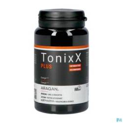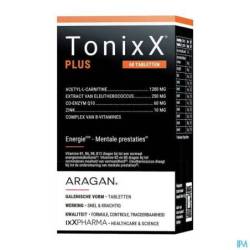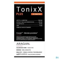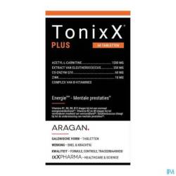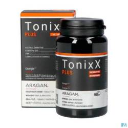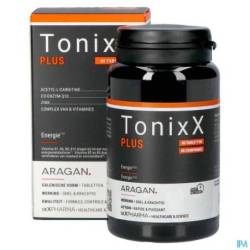 2 comprimés de TonixX PLUS contiennent 1500mg d'acétyl-L-carnitine, 100 mg de coenzyme Q10, 1,1 mg de vitamine B1 (100% AR), 1,4 mg de vitamine B2 (100% AR), 16 mg de vitamine B3 (100% AR), 6 mg de vitamine B5 (100% AR), 1,4 de mg vitamine B6 (100% AR), 2,5 µg de vitamine B12 (100% AR), 200 µg d'acide folique (100% AR), 50 µg de biotine (100% AR) et 10 mg du zinc (100% AR, sous forme de bisglycinate, une forme moderne bien assimilable).