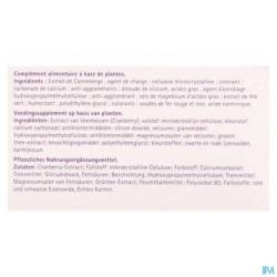 Extrait de cranberries (canneberge) (500mg) ; charge : cellulose microcristalline ; colorant : carbonate de calcium ; antiagglomérants : dioxyde de silicium, acides gras ; agent d'enrobage : hydroxypropylméthylcellulose ; antiagglomérant : sels de magnésium d'acides gras ; extrait de thé vert ; humectant : polyéthylène glycol ; colorants : oxydes de fer noir et rouge, acide carminique.