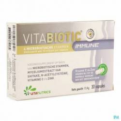 Souches microbiotiques microencapsulées : Lactobacillus plantarum LP02 (LMG P-21020), Lactobacillus rhamnosus LR04 (DSM 16605), Bifidobacterium animalis subsp. lactis BS01 (LMG P-21384), Lactobacillus paracasei – LPC00 (LMG P-21380), N-acétylcystéine, bisglycinate de zinc, extrait de mycélium de shitaké (Lentinula edodes), vitamine C, amidon de pomme de terre, gélule végétale (HPMC).