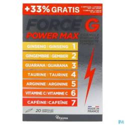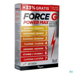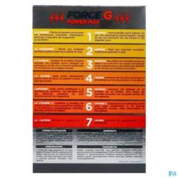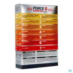 Force G Power Max est un complément alimentaire contenant du ginseng, du gingembre, du guarana, de la taurine, de l'arginine, de la vitamine C et de la caféine.