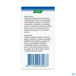 Agent de charge: amidon de maïs hydrolysé (Zea Mays L.), souches de bactéries (Bifidobacterium bifidum, Enterococcus faecium, Lactobacillus acidophilus, Lactobacillus salivarius, Lactococcus lactis), orme (Ulmus fulva), épaississant: cellulose microcristalline E460, enzyme: amylase.